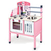Prepare tasty little dishes for your friends just like mom and dad and become a little chef! The all-wood maxi kitchen includes several accessories 3 spoons, 1 casserole with cover, a frying pan with a fried egg and a glove. Wood MDF (printed background, dark grey shelves, light pink side, doors, egg, pan, casserole), plywood (work plan, inner shelf), pine wood (sides of the kitchen), cotton glove, stainless steel (screws, sink). Height of the worktop 50 cm. Closed colour box with plastic handle.
