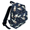 Midnight blue spaceboy mini childrens backpack perfect for school, picnics and hiking. Handy carrying handle and adjustable padded shoulder straps. Padded back zipped main compartment and small front pocket for easy access. To clean wipe with a damp cloth. Warning! Keep away from fire.