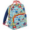 Construction Children's School Backpack features padded straps, name badge, fun zip pull, and two water bottle holders; Pattern shows a variety of tools.